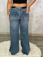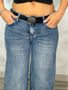 La modelo mide 1,65cm y viste una talla M. Jeans baggy con: pierna ancha y entrepierna ligeramente baja, cinturón incluido.